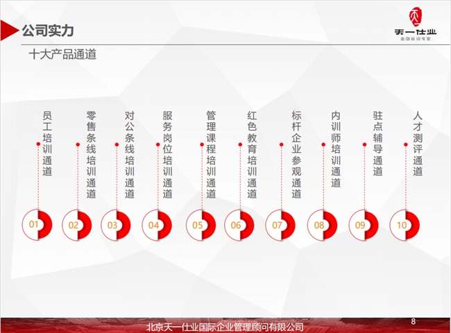 公司下设天一书院、天一亲子大学、天一青少年领袖训练中心、天一金融商学院等专业板块,构建了完善的产品体系与师资团队。核心产品涵盖十大核心通道:员工培训通道精准覆盖新老员工、不同年龄段从业者的职业成长需求;零售与对公条线培训通道紧扣业务痛点,赋能一线营销与服务效能;管理课程培训通道构建从后备干部到高级管理者的阶梯式培养体系;红色教育培训、标杆企业访学、内训师培训、驻点辅导、人才测评等通道则从多元维度满足金融机构的综合发展需求。