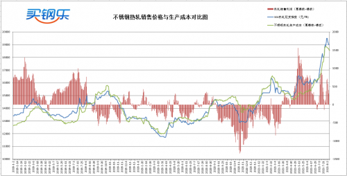 不锈钢使用高镍铁+镍板工艺冶炼304热轧生产成本约为18540元/吨,热轧销售价格高于生产成本460元/吨。