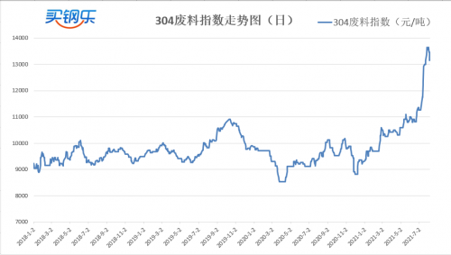 买钢乐304不锈钢废料现货指数收于13158元/吨,较上周下跌400元/吨,跌幅2.95%。