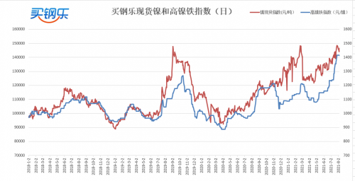 买钢乐高镍铁指数收于1413元/镍,较上周下跌3元/镍,跌幅0.19%;电解镍指数收于146475元/吨,较上周下跌1200元/吨,跌幅0.85%。