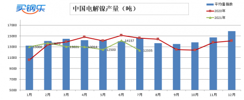 7月中国电解镍产量12335吨较6月14157吨减少了1822吨
