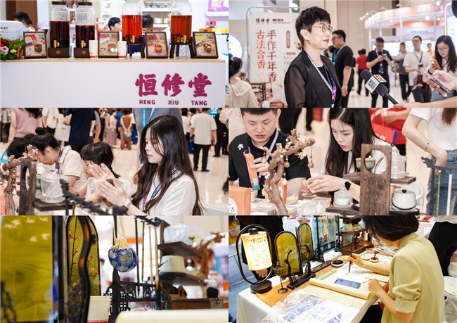 在线下展会中,恒修堂打造的沉浸式中式养生空间,巧妙融合感官体验与文化意趣:从焚香、茶饮、抄经到手作互动,再到中药耳环、相框画、香囊等“药香同源”文创,传统中药以轻盈姿态走入当下生活。现场提供的红曲米陈皮菊花茶、气血双补茶、酸梅汤等多款新中式养生茶饮,搭配即食养生零食,为年轻人带来随手可得的“轻养生”选择。通过可感知、可参与、可分享的体验,中药养生不再只是“长辈的专属”,而成为年轻人青睐的生活美学与日常潮流。