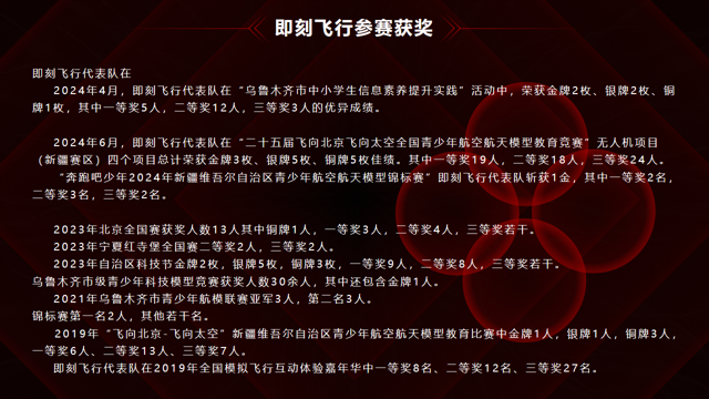 凭借扎实的教育成果与广泛的社会影响,“即刻飞行”先后被自治区科学技术协会、自治区体育局、乌鲁木齐市科学技术协会授予: